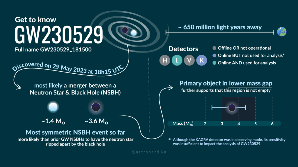 In May 2023, shortly after the start of the fourth LIGO-Virgo-KAGRA observing run, the LIGO Livingston detector observed a gravitational-wave signal from the collision of what is most likely a neutron star with a compact object that is 2.5 to 4.5 times the mass of our Sun. Neutron stars and black holes are both compact objects, the dense remnants of massive stellar explosions. What makes this signal, called GW230529, intriguing is the mass of the heavier object. It falls within a possible mass-gap between the heaviest known neutron stars and the lightest black holes. The gravitational-wave signal alone cannot reveal the nature of this object. Future detections of similar events, especially those accompanied by bursts of electromagnetic radiation, could hold the key to solving this cosmic mystery.